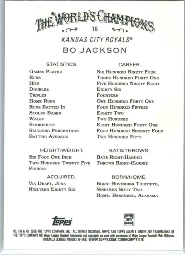This is a nice example of a 2025 Topps Allen & Ginter #18 Bo Jackson