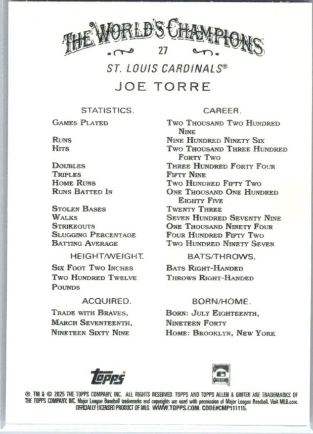 This is a nice example of a 2025 Topps Allen & Ginter #27 Joe Torre