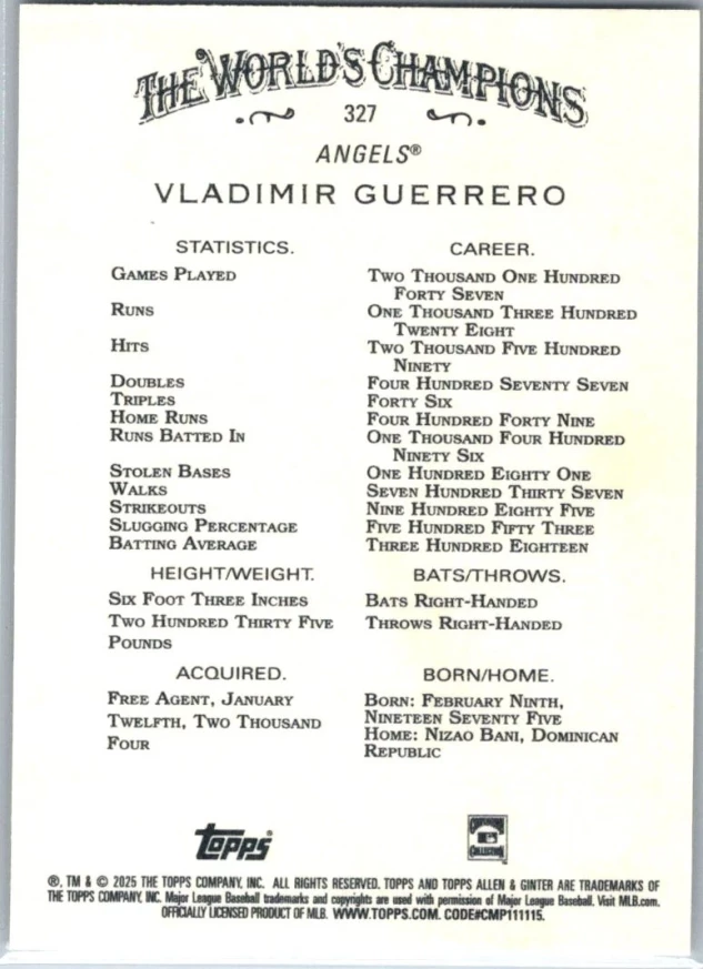 This is a nice example of a 2025 Topps Allen & Ginter #327 Vladimir Guerrero