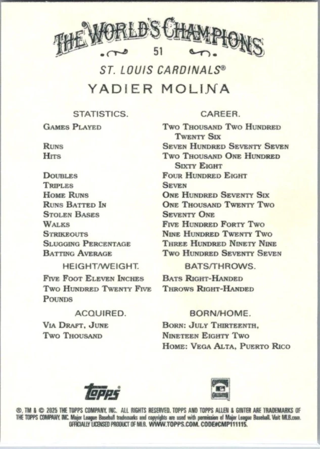This is a nice example of a 2025 Topps Allen & Ginter #51 Yadier Molina