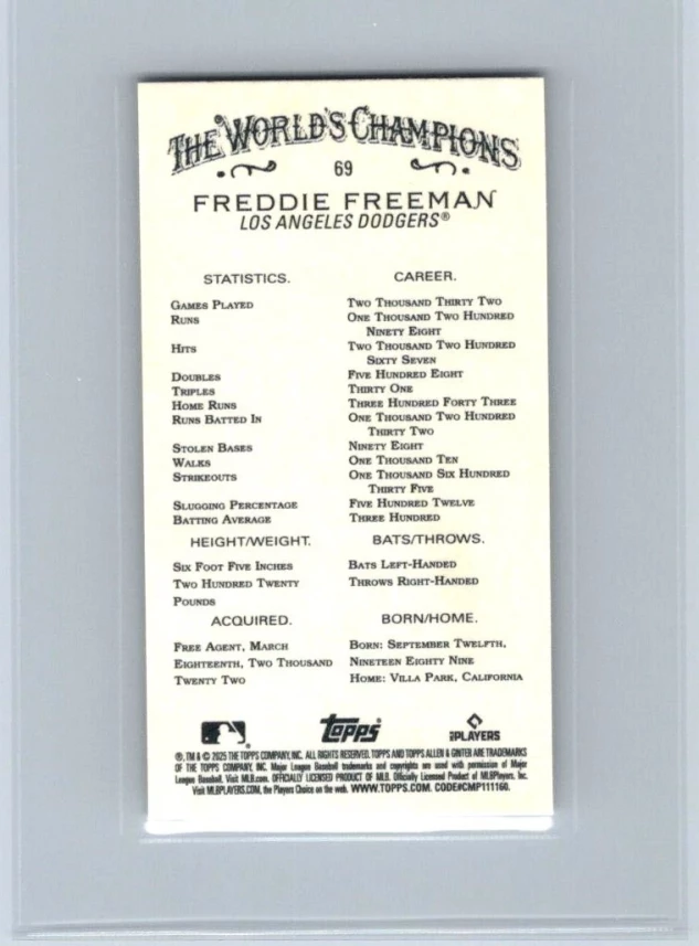 This is a nice example of a 2025 Topps Allen & Ginter #69 Freddie Freeman Mini