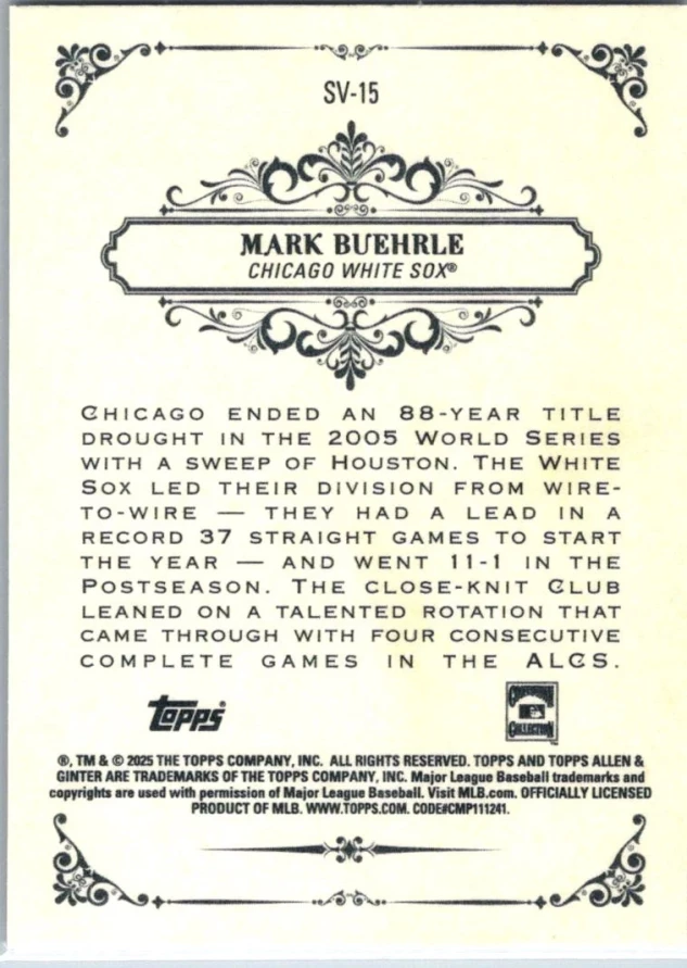This is a nice example of a 2025 Topps Allen & Ginter #SV-15 Mark Buehrle Sweet Victory