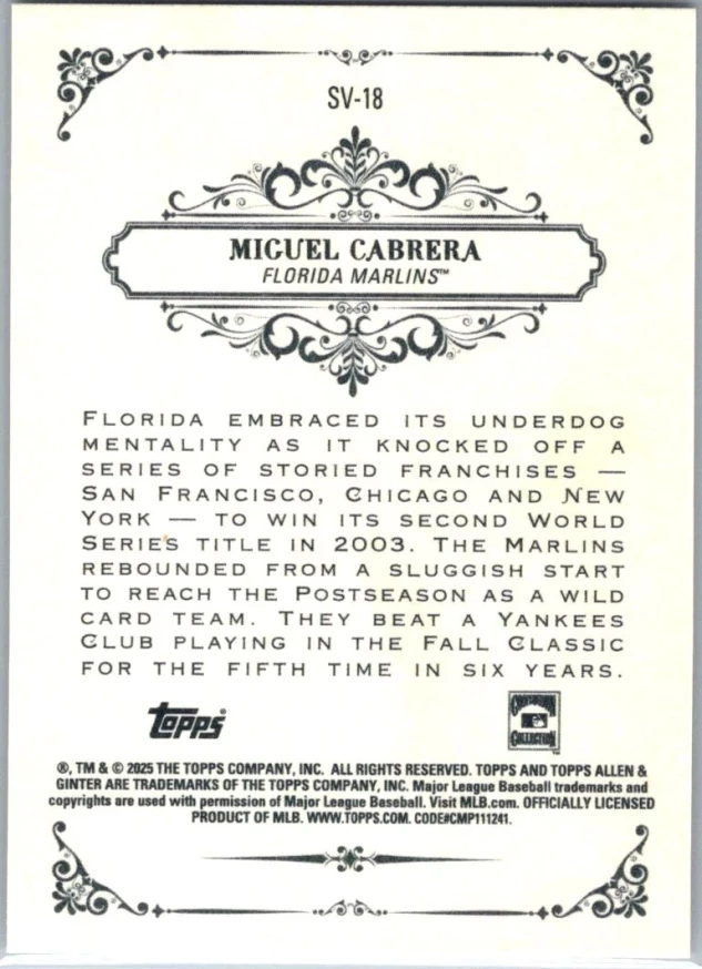 This is a nice example of a 2025 Topps Allen & Ginter #SV-18 Miguel Cabrera Sweet Victory