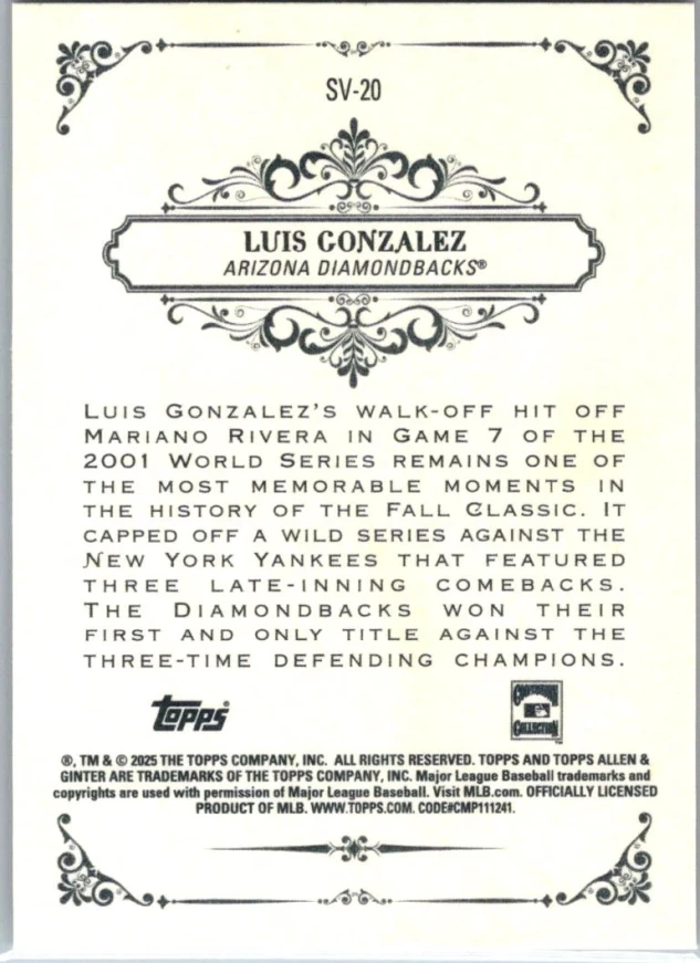 This is a nice example of a 2025 Topps Allen & Ginter #SV-20 Luis Gonzalez Sweet Victory
