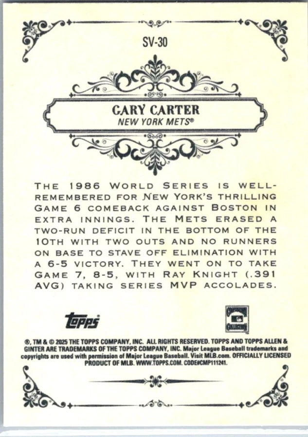 This is a nice example of a 2025 Topps Allen & Ginter #SV-30 Gary Carter Sweet Victory
