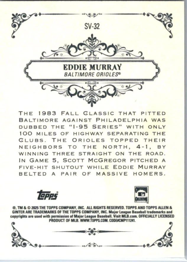 This is a nice example of a 2025 Topps Allen & Ginter #SV-32 Eddie Murray Sweet Victory