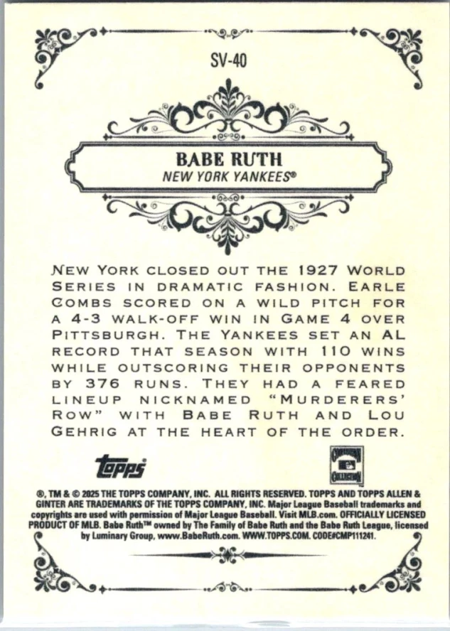 This is a nice example of a 2025 Topps Allen & Ginter #SV-40 Babe Ruth Sweet Victory