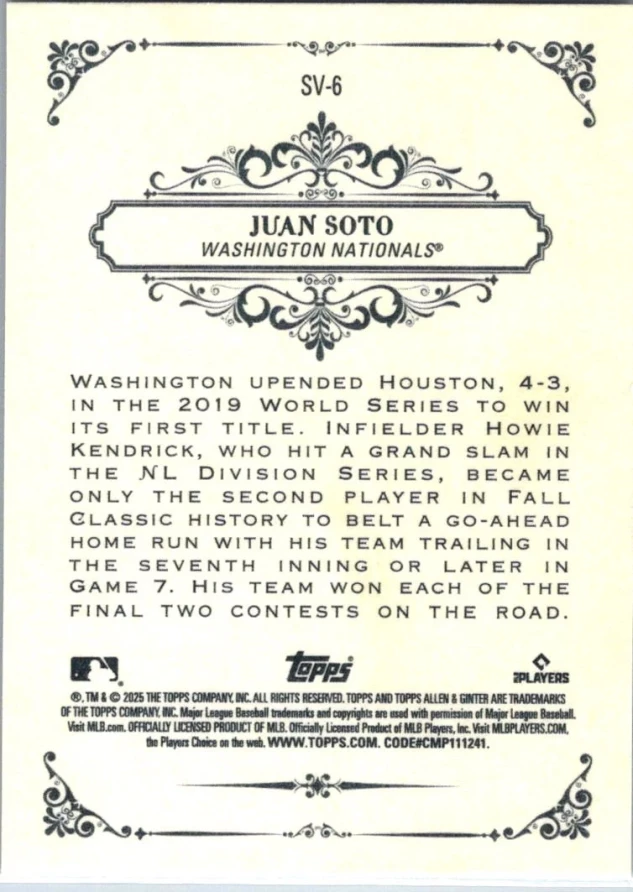 This is a nice example of a 2025 Topps Allen & Ginter #SV-6 Juan Soto Sweet Victory
