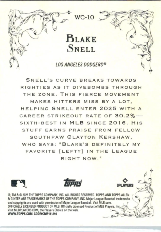 This is a nice example of a 2025 Topps Allen & Ginter #WC-10 Blake Snell Wicked Curves