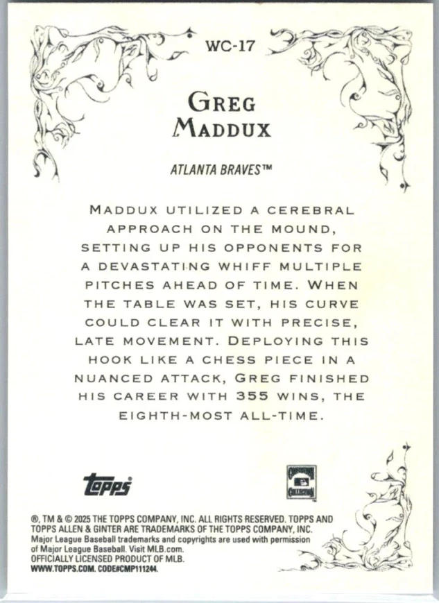 This is a nice example of a 2025 Topps Allen & Ginter #WC-17 Greg Maddux Wicked Curves