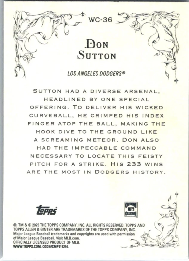 This is a nice example of a 2025 Topps Allen & Ginter #WC-36 Don Sutton Wicked Curves