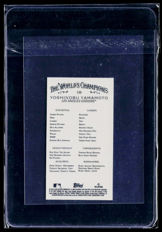 You are purchasing a 2025 Topps Allen & Ginter Yoshinobu Yamamoto #138 Mini Black Border. You will receive the exact item in the photographs. Thank you for looking.