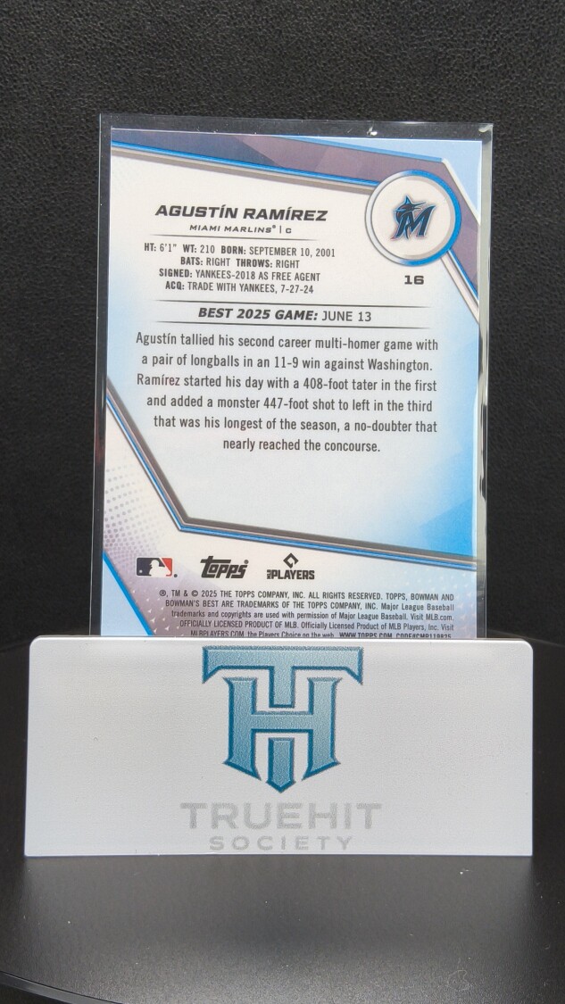 You are purchasing a 2025 Topps Bowman's Best Agustín Ramírez #16 RC. You will receive the exact item in the photographs. Thank you for looking.