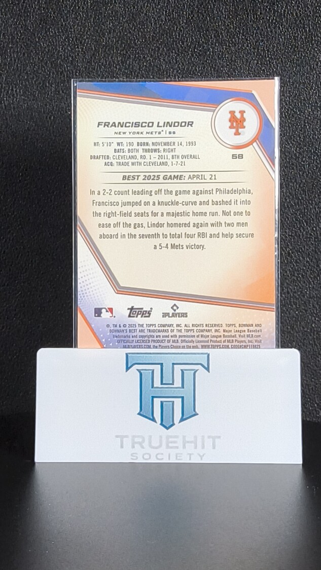 You are purchasing a 2025 Topps Bowman's Best Francisco Lindor #B22-FL. You will receive the exact item in the photographs. Thank you for looking.