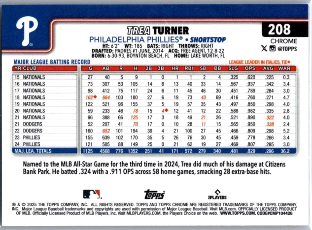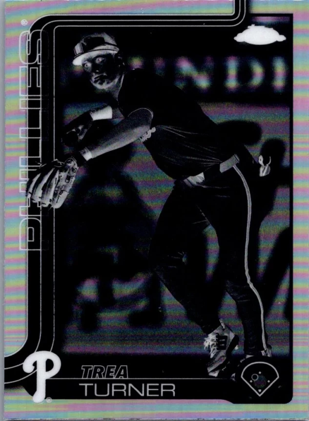 This is a nice example of a 2025 Topps Chrome #208 Trea Turner Negative Refractors