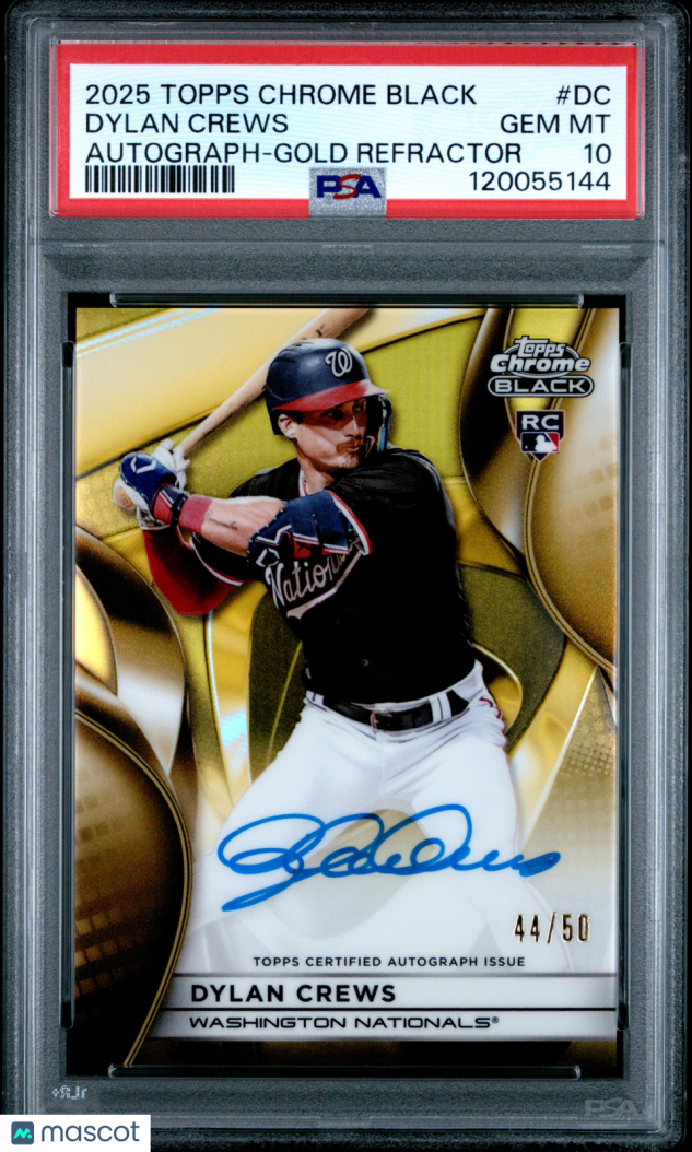 Don't miss your chance to own this stunning 2025 Topps Chrome Black Autographs Dylan Crews Gold Refractor, serial numbered out of just 50! This rare MLB collectible features an on-card autograph from Dylan Crews of the Washington Nationals, graded a perfect PSA 10 with zero higher in population—making it a true gem for serious collectors and Nationals fans alike.