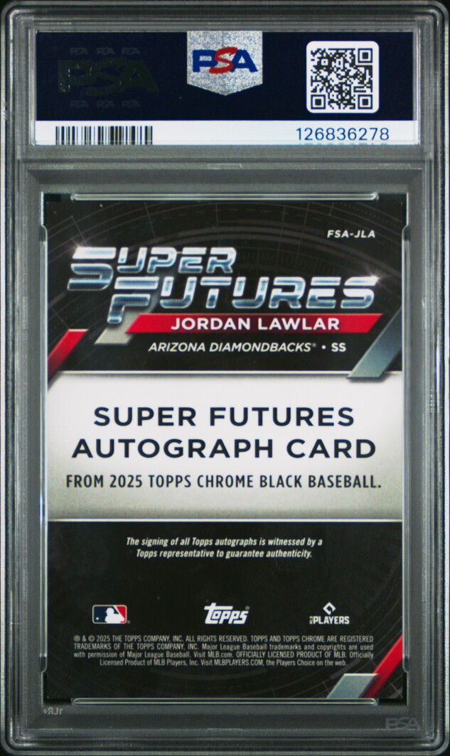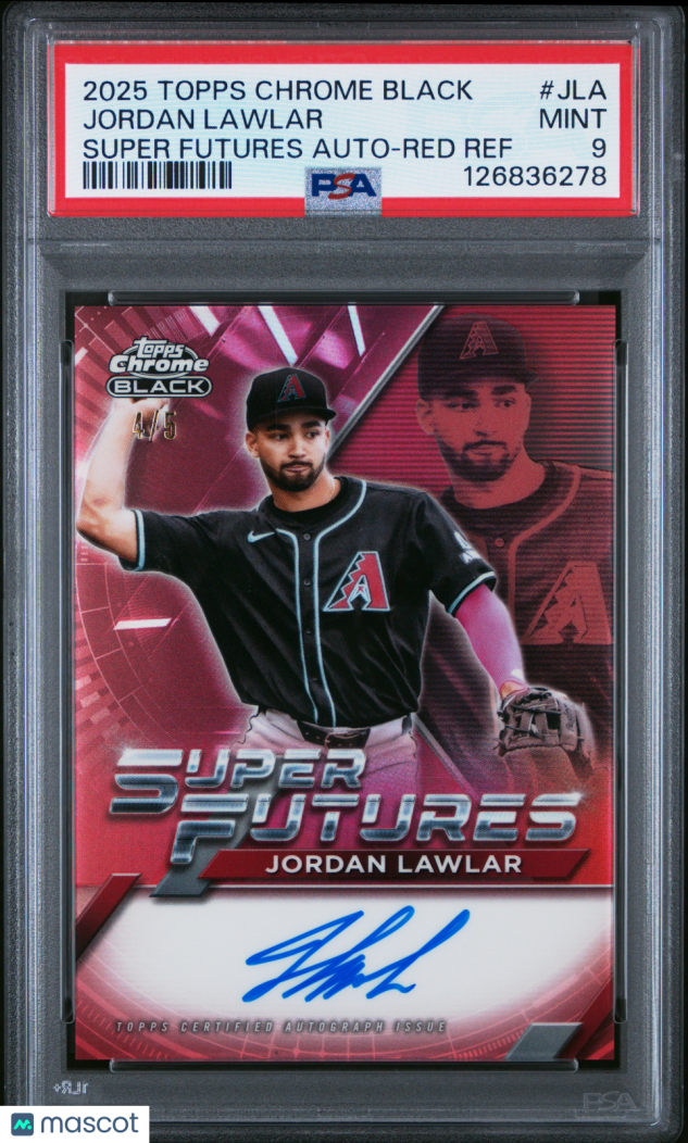 You are purchasing a 2025 Topps Chrome Black Super Futures Autographs Jordan Lawlar #JLA Red 4/5 PSA 9. You will receive the exact item in the photographs. Thank you for looking.