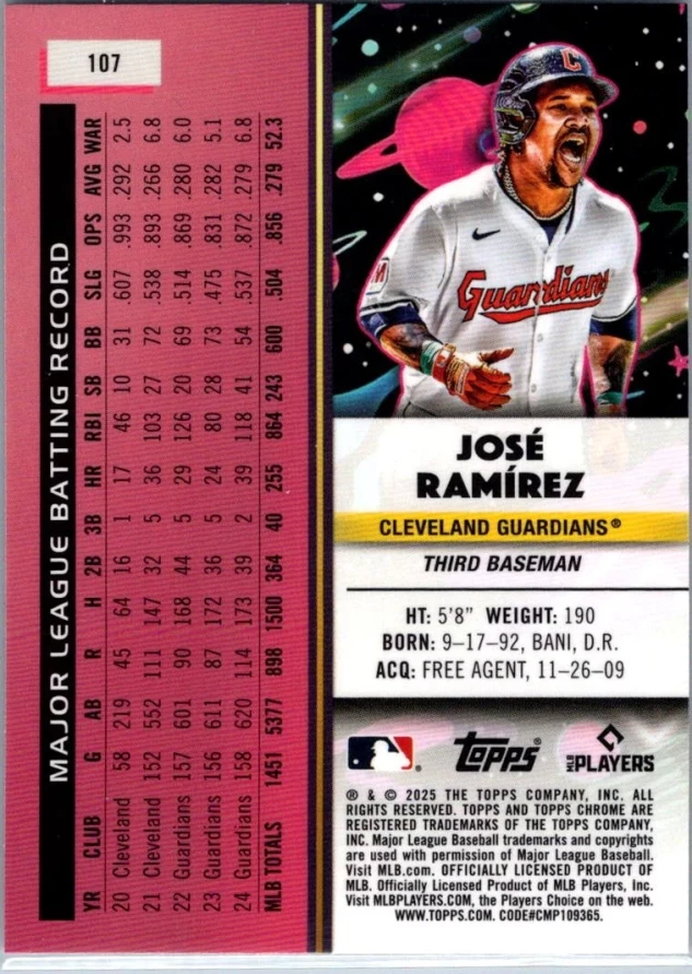 This is a nice example of a 2025 Topps Chrome Cosmic #107 José Ramírez