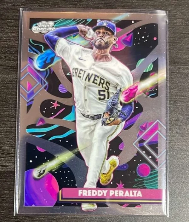 This is a nice example of a 2025 Topps Chrome Cosmic #122 Freddy Peralta