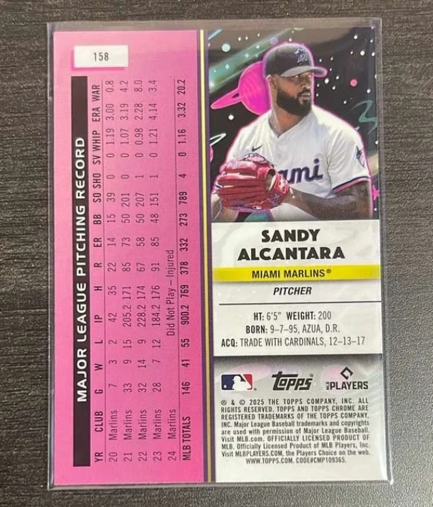 This is a nice example of a 2025 Topps Chrome Cosmic #158 Sandy Alcantara