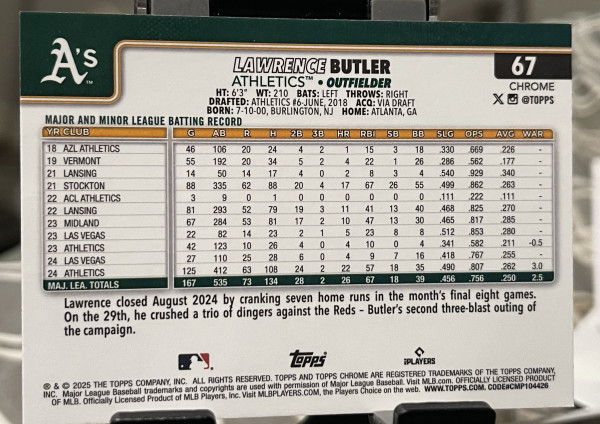 2025 Topps Chrome - Lawrence Butler #67 Variation SP Oakland Athletics