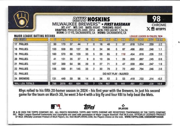 2025 Topps Chrome Sepia Refractors #98 Rhys Hoskins - Milwaukee Brewers
