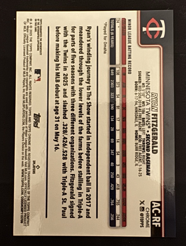 2025 TOPPS CHROME UPDATE CHROME UPDATE AUTOGRAPHS RF RYAN FITZGERALD AQUA WAVE