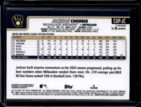 2025 TOPPS CHROME UPDATE CUPFRACTOR AUTOGRAPH #CUP-JC JACKSON CHOURIO (38/50)