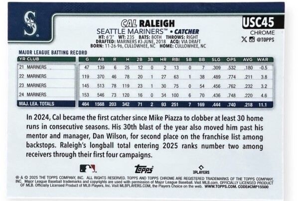 2025 Topps Chrome Update Series - Cal Raleigh #USC45 Negative Refractor