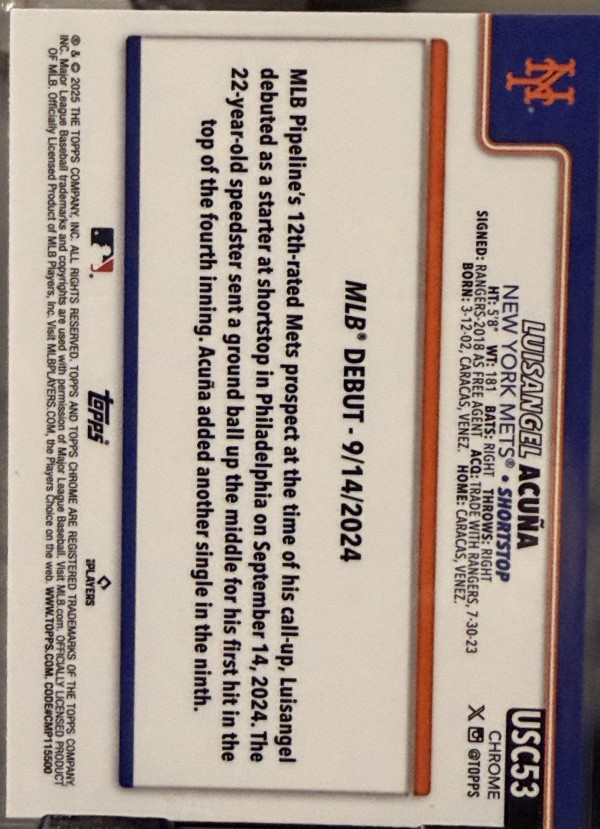 2025 Topps Chrome Update Series - Rookie Debut Luisangel Acuna #USC53 X-Fractor (RC)