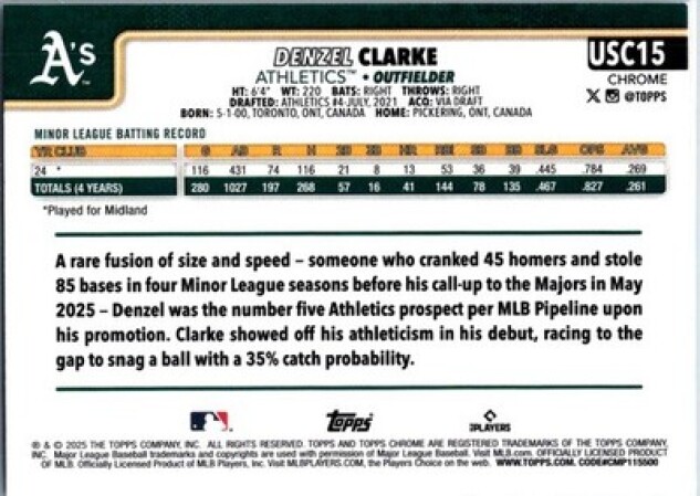 This is a nice example of a 2025 Topps Chrome Update #USC15 Denzel Clarke