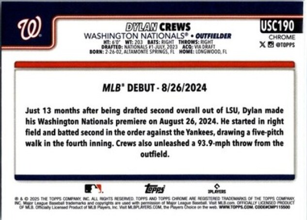 2025 Topps Chrome Update #USC190 Dylan Crews