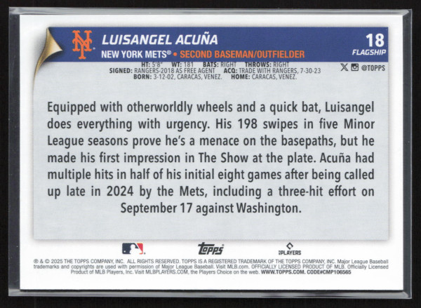 You are purchasing a 2025 Topps Flagship Luisangel Acuña #18 RC. You will receive the exact item in the photographs. Thank you for looking.