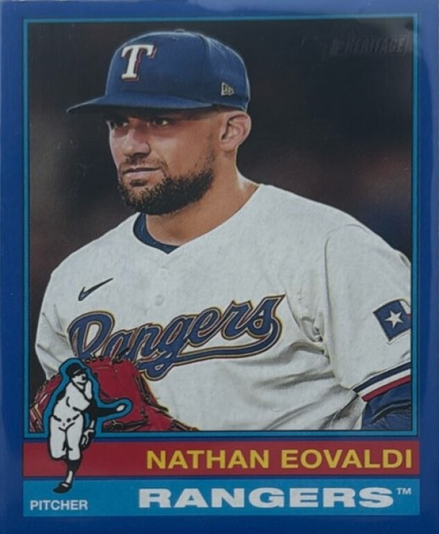 Don't miss your chance to add this stunning 2025 Topps Heritage Chrome #34 Nathan Eovaldi Blue Bordered parallel to your Texas Rangers collection! This highly sought-after card features a beautiful blue border and comes serial numbered, making it a rare find for serious collectors and fans alike. With its sharp design and vibrant colors, this card is a standout addition to any baseball card portfolio.