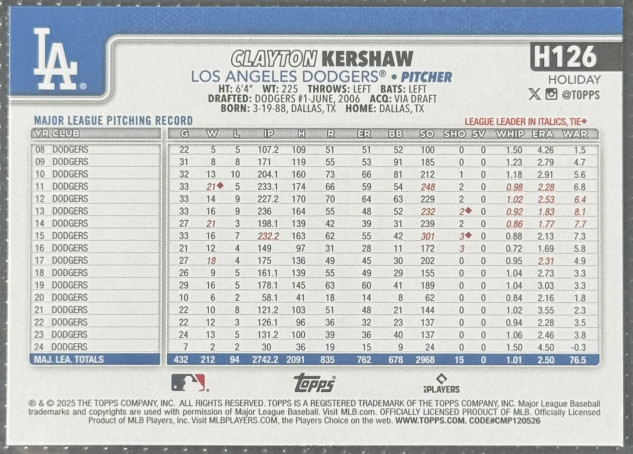 2025 Topps Holiday Clayton Kershaw #H126 - LA Dodgers