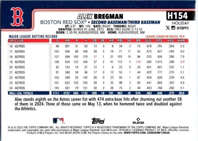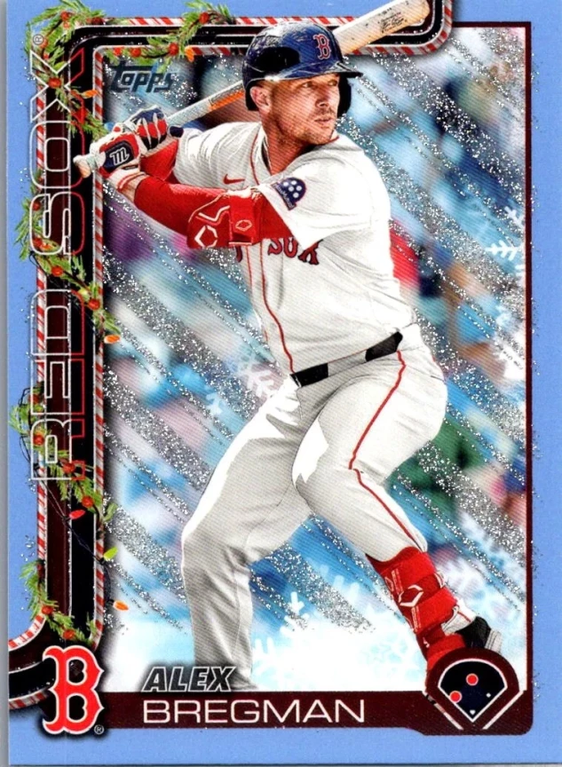 This is a nice example of a 2025 Topps Holiday #H154 Alex Bregman Light Blue & White Glitter Holiday
