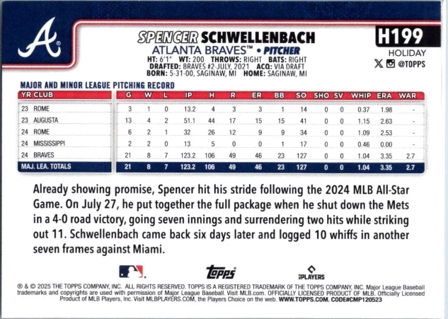 This is a nice example of a 2025 Topps Holiday #H199b Spencer Schwellenbach