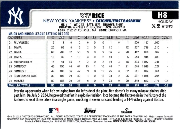 In 2025 Ben Rice played for the New York Yankees.
