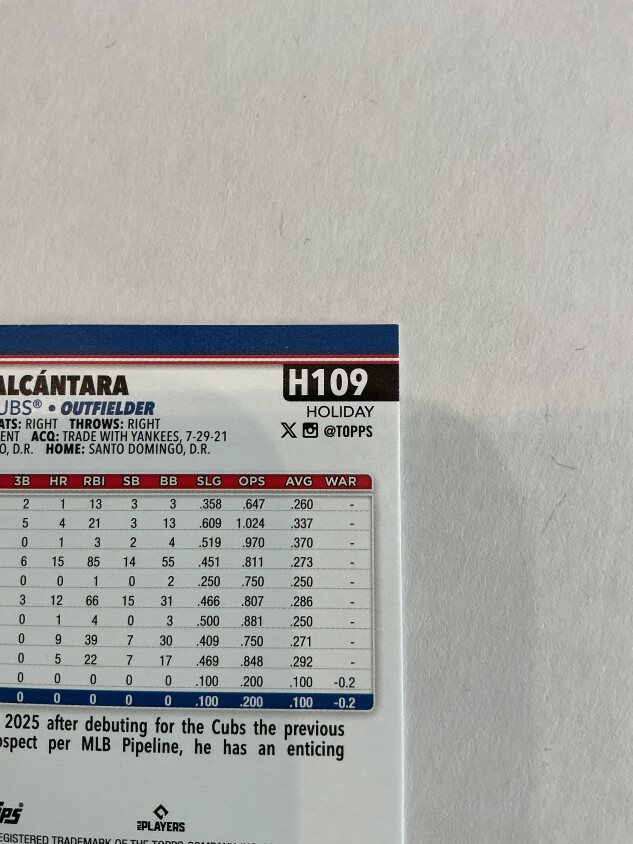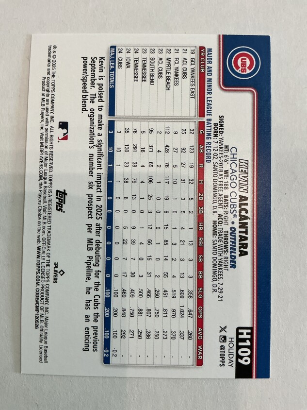 Don't miss your chance to add the highly sought-after 2025 Topps Holiday Kevin Alcantara Rookie Card (#H109) to your Chicago Cubs or MLB collection! This fresh release from Topps is a must-have for fans and collectors looking for the next breakout star, featuring Alcantara in his official rookie year with the Cubs.