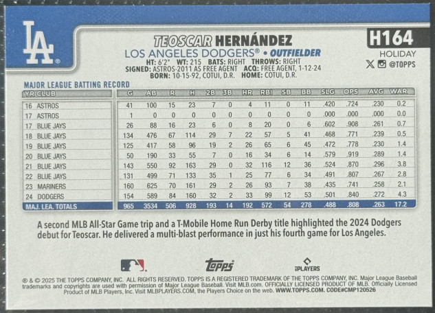 2025 Topps Holiday Teoscar Hernandez #H164 - LA Dodgers