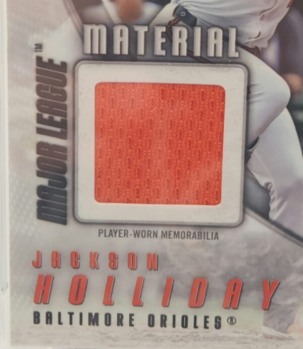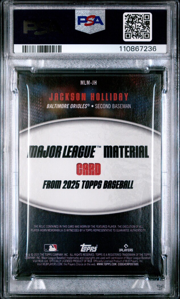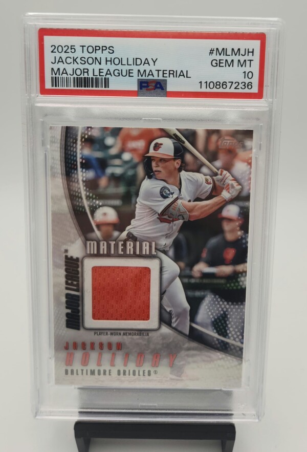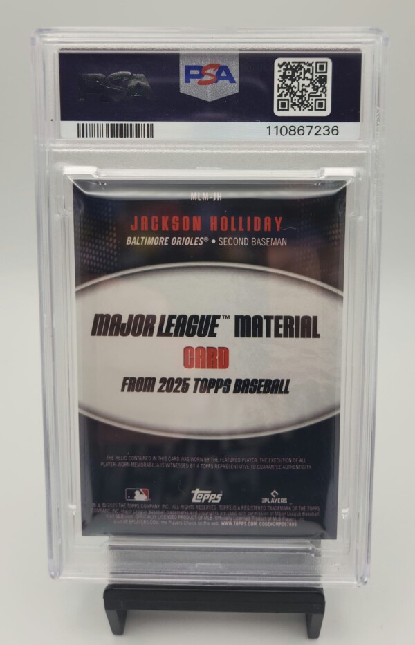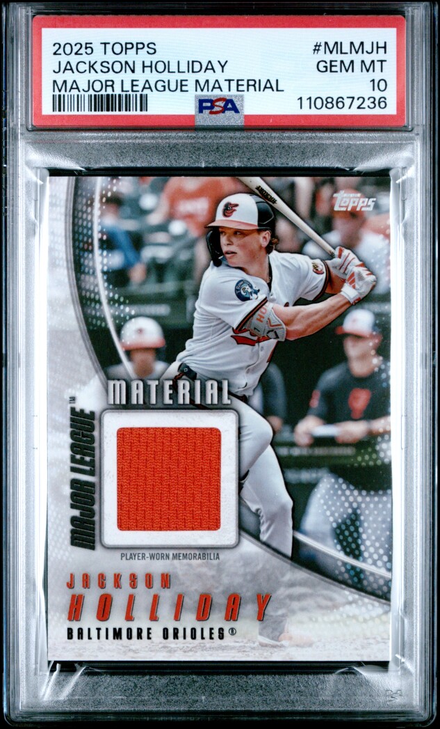 Up for sale is a 2025 Topps Major League Material Relic card of Jackson Holliday, graded PSA 10 Gem Mint โ a premium collectible featuring player-worn memorabilia.