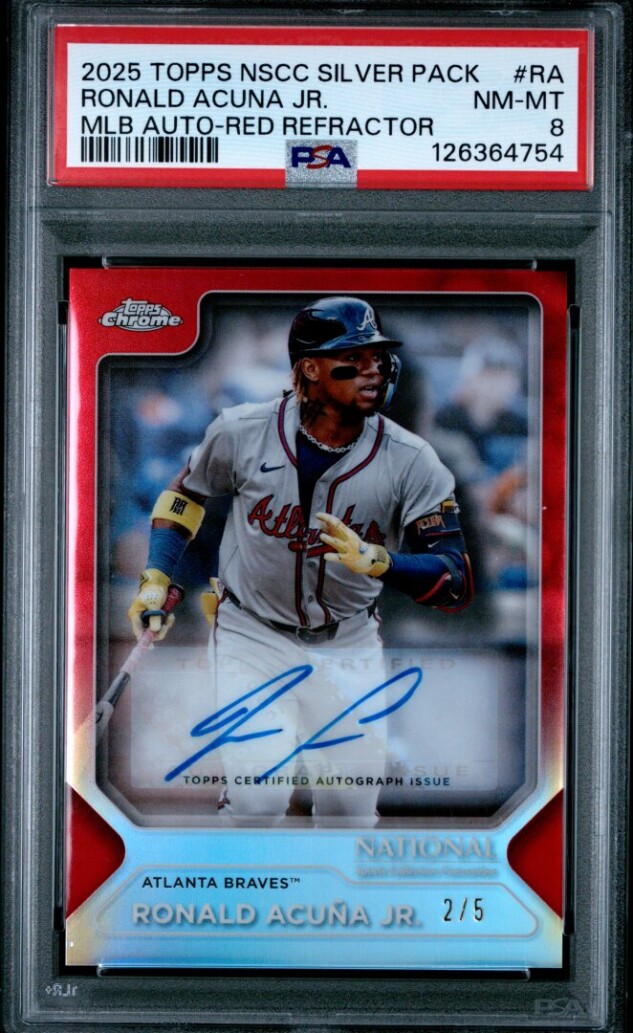 Thanks for your looking at my listing 2025 Topps National Sports Collectors Convention Silver Pack Major League Baseball Autographs Ronald Acuna Jr. Mlb Auto-red Refractor PSA 8. Let me know if you have any questions!