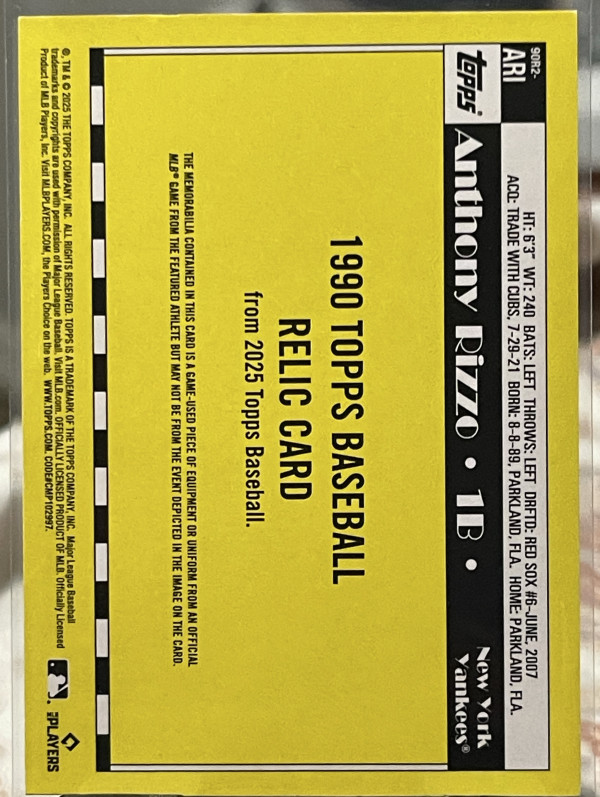 2025 Topps Series 2 -1990 Topps BaseballRelics Anthony Rizzo#90R2-ARI (MEM)