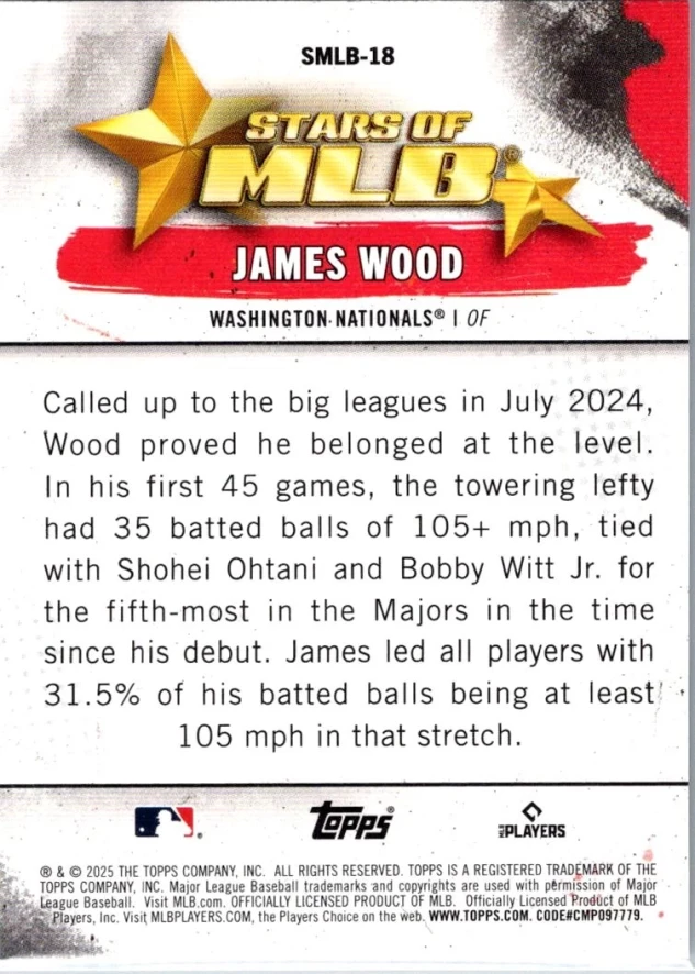 This is a nice example of a 2025 Topps #SMLB-18 James Wood Stars of MLB