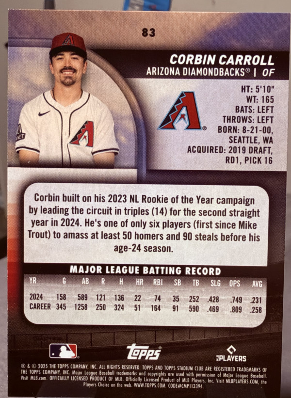 2025 Topps Stadium #83 Corbin Carroll Arizona Diamondbacks