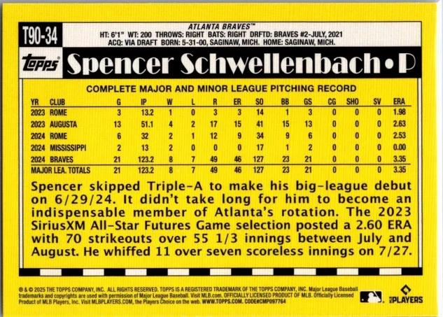 This is a nice example of a 2025 Topps #T90-34 Spencer Schwellenbach 1990 Topps Baseball 35th Anniversary (Series One)