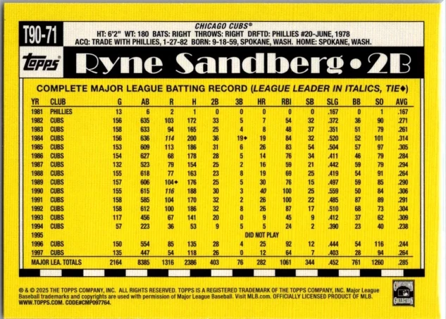 This is a nice example of a 2025 Topps #T90-71 Ryne Sandberg 1990 Topps Baseball 35th Anniversary (Series One)