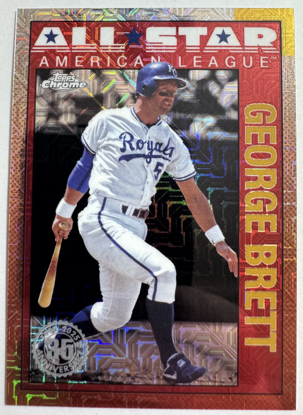 The product is a 2025 Topps trading card from the 1990 All-Star Baseball Series featuring George Brett of the Kansas City Royals. This highly sought-after card is a limited edition Gold Crackle Foil parallel, with only 50 copies produced. It is serial numbered and showcases Brett as one of the top players in baseball history. Perfect for collectors and fans of the sport, this card represents a valuable addition to any trading card collection.