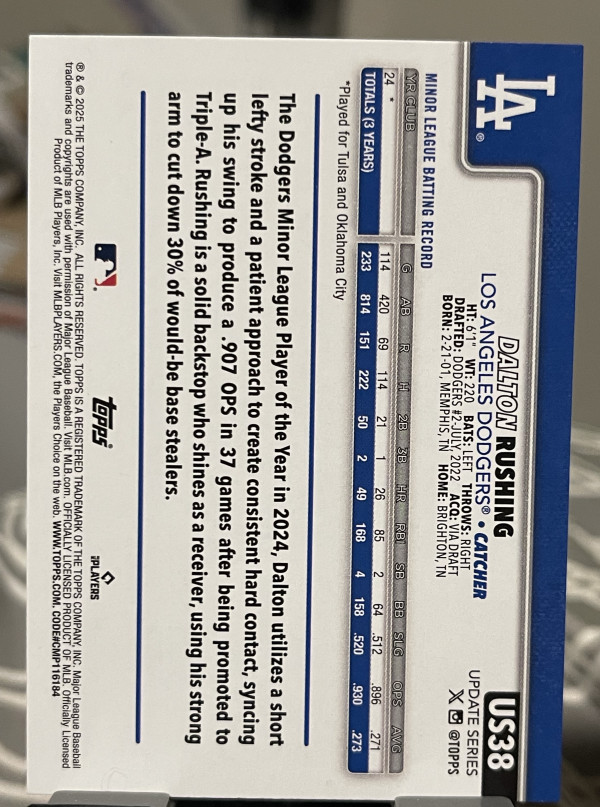 2025 Topps Update Series - Dalton Rushing #US38 (RC)