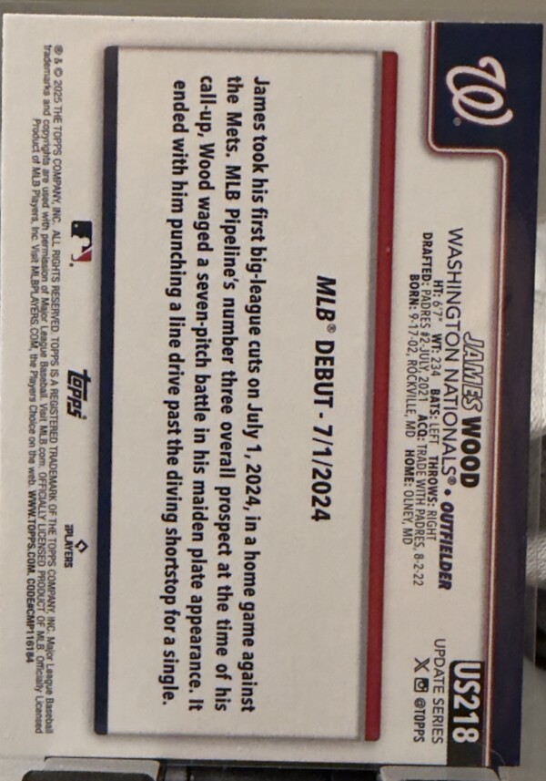 2025 Topps Update Series - Rookie Debut James Wood #US218 (RC)